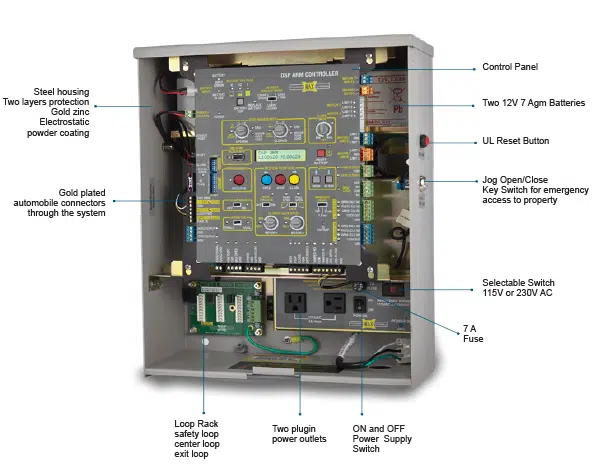 - Two 7amp hour batteries provides 500 cycles in case of power failure with three modes of battery backup, open once, leave open or leave closed